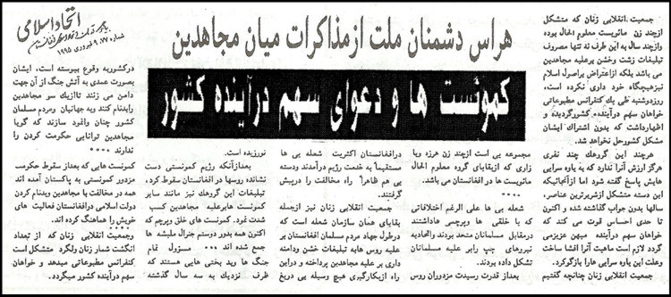 ـ در آستانهی سقوط دولت پوشالی نجيب، پشتون های دو حزب خلق و پرچم با «برادر حكمتيار» و دری زبانان آن دو حزب يا «برادران قيادی»ات ربانی و مسعود، عقد «هماهنگی» بستند. اما راست بگو امير «صاحب» چه تعداد از دون پايه های آن دو حزب ـ به نسبت كماهميت بودن اتحاد اسلامیـ با «برادران اتحاد» چلهی «هماهنگی» بدل كردند؟ اگر جواب بدهی كه هيچ، پس اين را روشن بساز كه در آن جشنهای شادی و همبستگی، تكليف «پروفيسر» چی بود؟ صرف سوره خوانی آن عقد ها؟